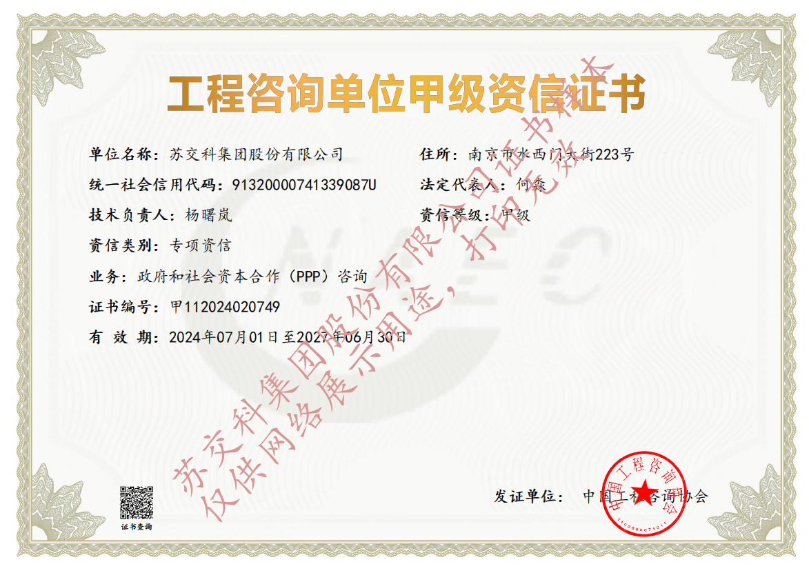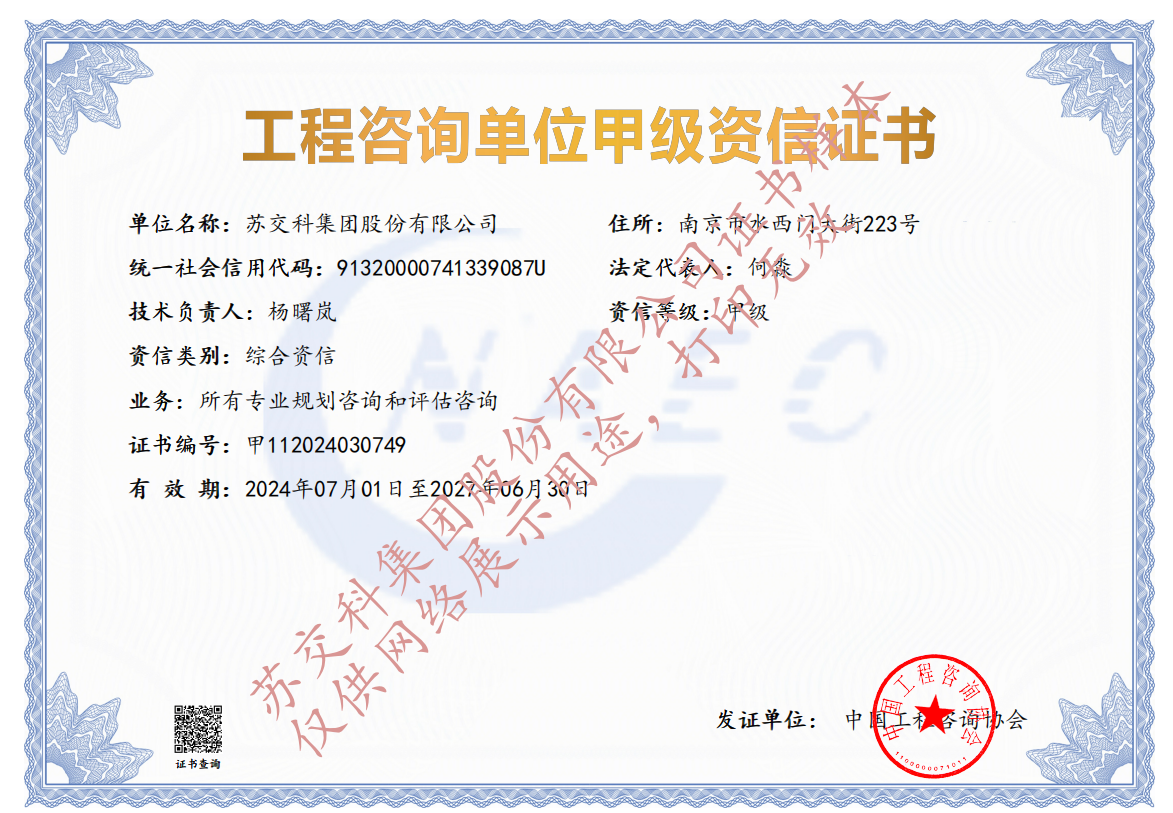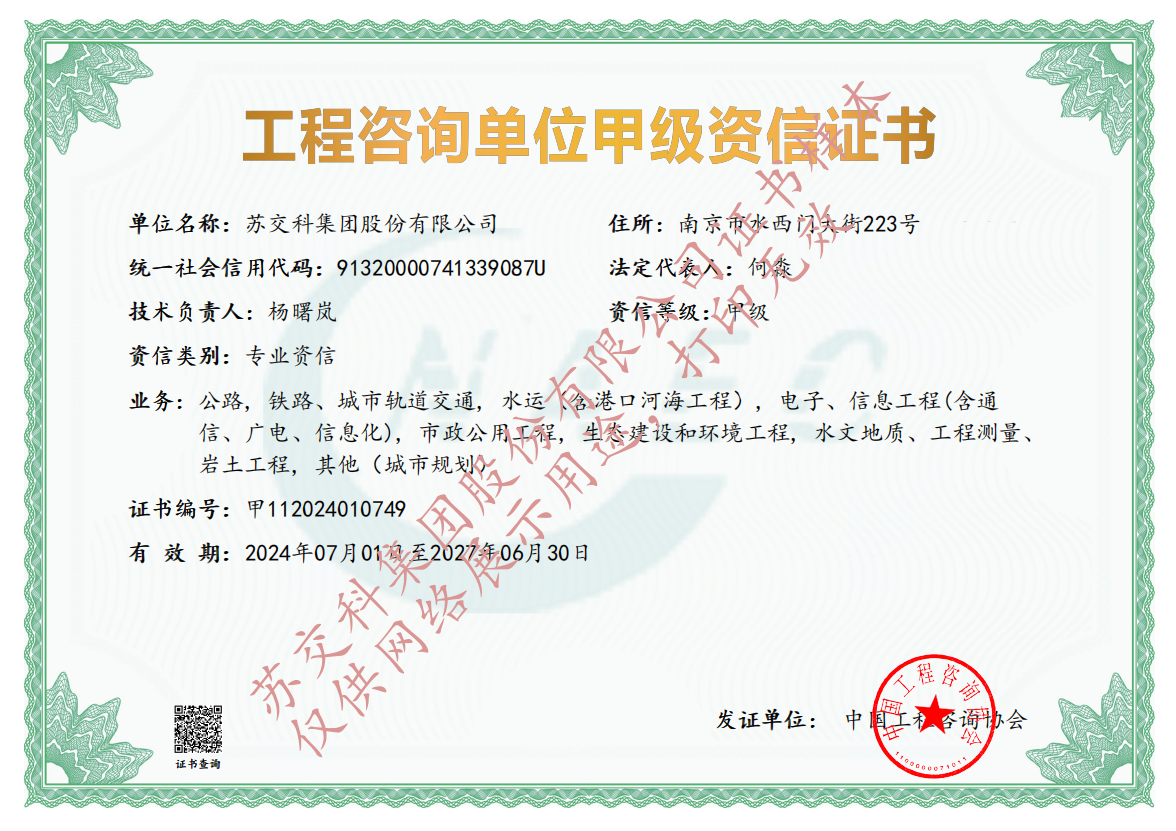 集團(tuán)資質(zhì)蘇交科擁有工程行業(yè)各領(lǐng)域甲級資質(zhì),包括城鄉(xiāng)規(guī)劃甲級資質(zhì);工程咨詢綜合甲級資質(zhì);工程咨詢專業(yè)甲級資質(zhì)(公路、生態(tài)建設(shè)和環(huán)境工程、水文地質(zhì)、工程測量、巖土工程、城市規(guī)劃、鐵路、城市軌道交通、港口河海工程、市政公用工程(市政交通、給排水)、水利工程、旅游工程);工程設(shè)計綜合甲級資質(zhì);工程勘察綜合類甲級資質(zhì);測繪甲級資質(zhì);公路工程和市政公用工程總承包一級資質(zhì);公路工程、水運(yùn)工程、市政公用工程監(jiān)理甲級資質(zhì);公路工程甲級、公路工程交通工程專項、水運(yùn)工程材料甲級和水運(yùn)工程結(jié)構(gòu)甲級試驗檢測資質(zhì)。