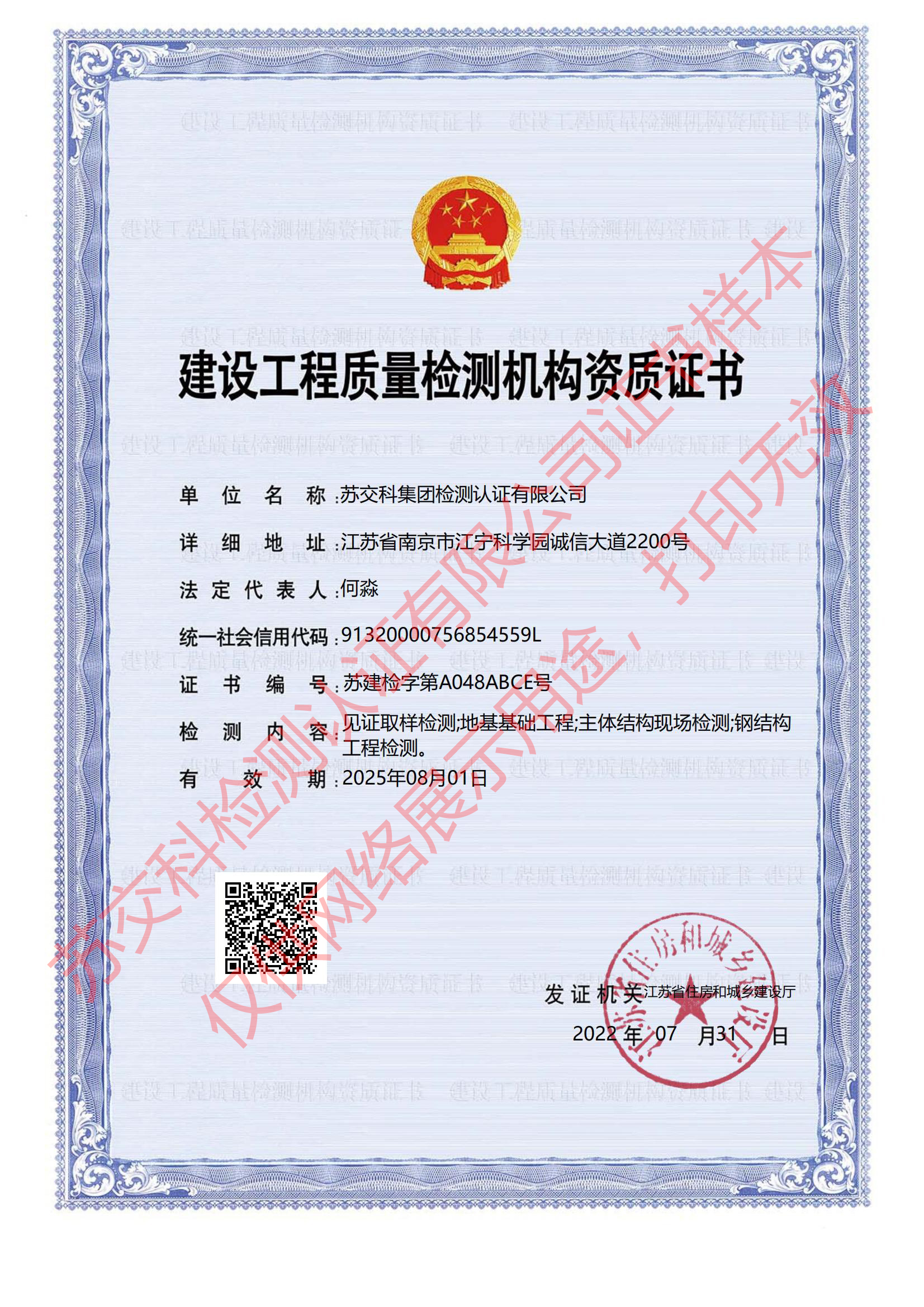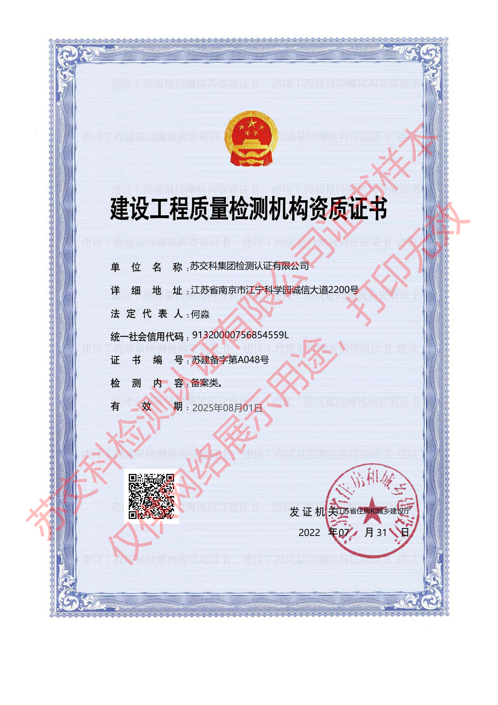 蘇交科檢測(cè)認(rèn)證建設(shè)工程質(zhì)量檢測(cè)機(jī)構(gòu)資質(zhì)證書(shū)(備案類)